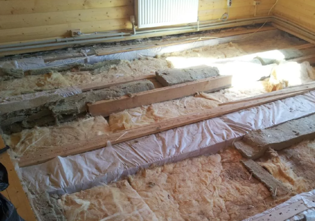 Поверхность оценивают с помощью уровня и при необходимости выравнивают рубанком. Далее кладут гидроизоляционный материал, делая припуск на стены 10 см. В пространство между лагами укладывают плитный или насыпной теплоизолятор и накрывают его гидроизоляционным материалом. Между утеплителем и напольным покрытием должен оставаться вентиляционный зазор. Если высота лаг не позволяет этого, то необходимо дополнительно смонтировать контробрешетку. На завершающем этапе утепления настилают чистовой деревянный пол и облицовочное покрытие.