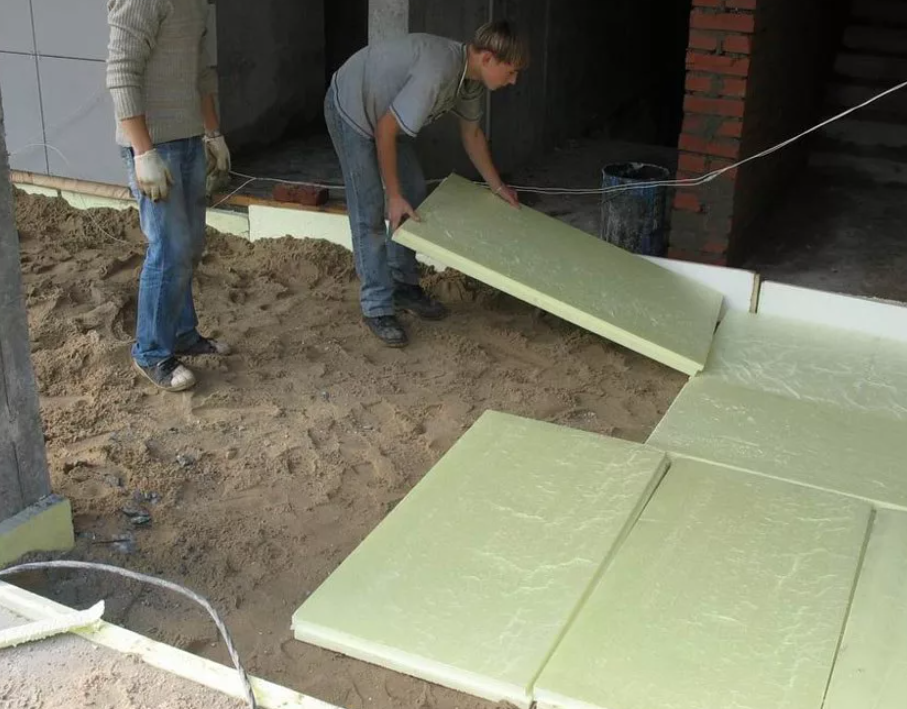 - На стяжку или плиту помещают утеплитель — насыпной или плитный (полистирол, минвату), тщательно выравнивают.