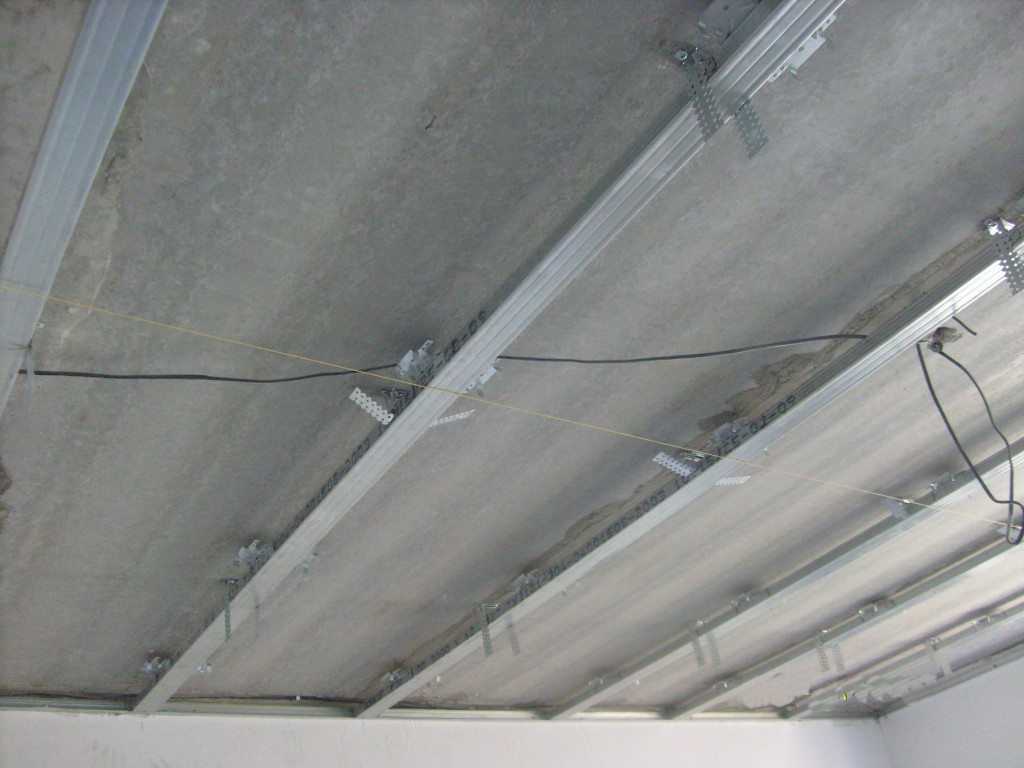 Далее приступайте к установке профилей, на которые будет нашиваться первый уровень. Для этого установите их в направляющие, а к потолку крепите посредством строительной монтажной стальной ленты, расстояние соблюдайте все в те же полметра. Профили располагайте продольно, в одной плоскости, через каждые 60 сантиметров, от одной стены до другой.