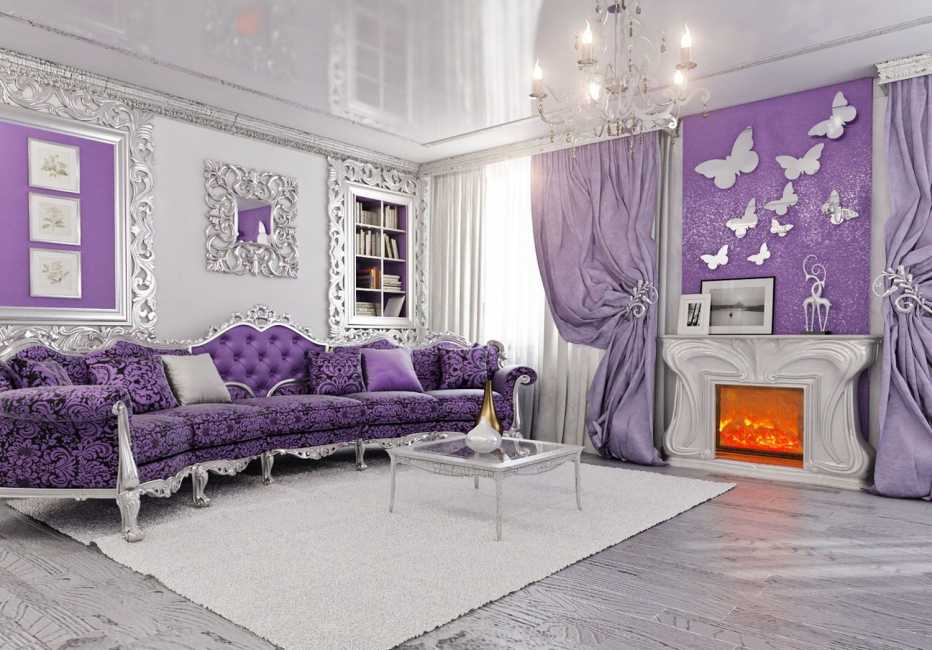 Гостиная является местом приема гостей и отдыха хозяев. Поэтому она должна производить положительное впечатление и быть комфортной. Учитывая эти требования, лучше всего использовать на стенах вкрапления данного цвета на фоне спокойных тонов. К примеру, можно использовать светлые обои для стен с фиолетовыми цветами.