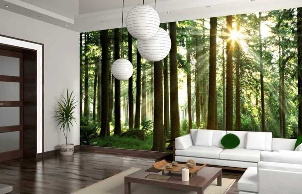 Таким полотном не оклеиваются все стены, а лишь фрагменты, акцентирующие на себе внимание. В нашей статье вы сможете увидеть, как Зд фотообои в интерьере выступают ярким украшением однотонной отделки стен, например, фото гостиной комнаты с панорамой красивого леса или горного пейзажа и др