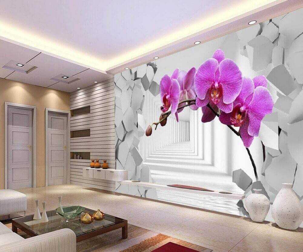 Это более привычные нам рулонные обои, но разница заключается в том, что они содержат трехмерные изображения геометрических узоров, абстракций или цветочных принтов. Стандартные фотообои 3д могут довольно эффектно оформить комнату, если будут оклеены все стены или же выделена отдельная функциональная зона. Их достоинство заключается в простоте монтажа, так как не требуется четкая стыковка рисунка.