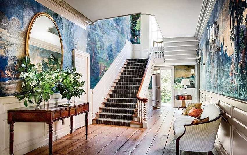 В холле частного дома для отделки стен использованы фотообои, имитирующие роспись красками