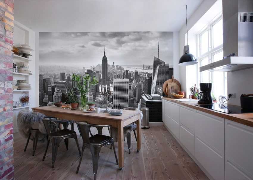 Черно-белые обои с городским пейзажем в интерьере кухни