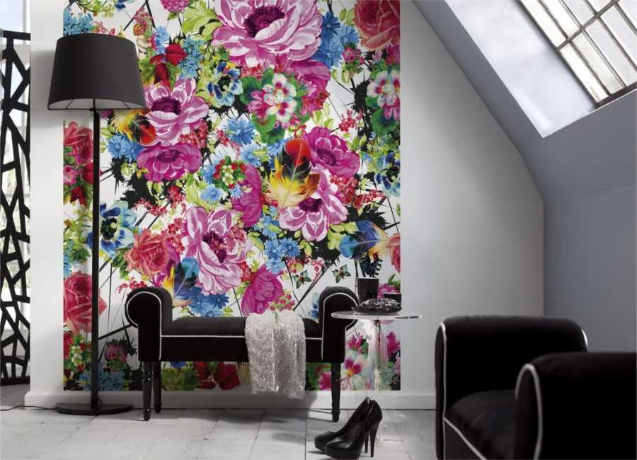 Если изображение яркое и содержит много крупных элементов, то обои в этом случае тоже лучше выбирать однотонные. Их оттенок может быть белым, серым или цвета пудры. Неплохо будет гармонировать с такими фотообоями и ненавязчивая абстракция.