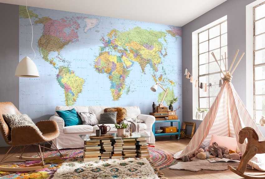 фотообои с изображением географической карты мира – отличное решение для оформление интерьера школьника