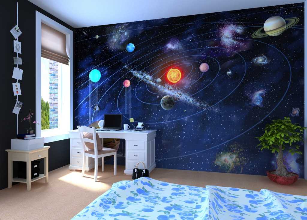 Дети постарше и подростки любят стереоскопические фотообои с 3д эффектом. На них изображен панорамный рисунок, на котором за счет отражения и преломления света создается иллюзия объема. Не стоит украшать ими более одной стены — объемные изображения провоцируют переутомление.