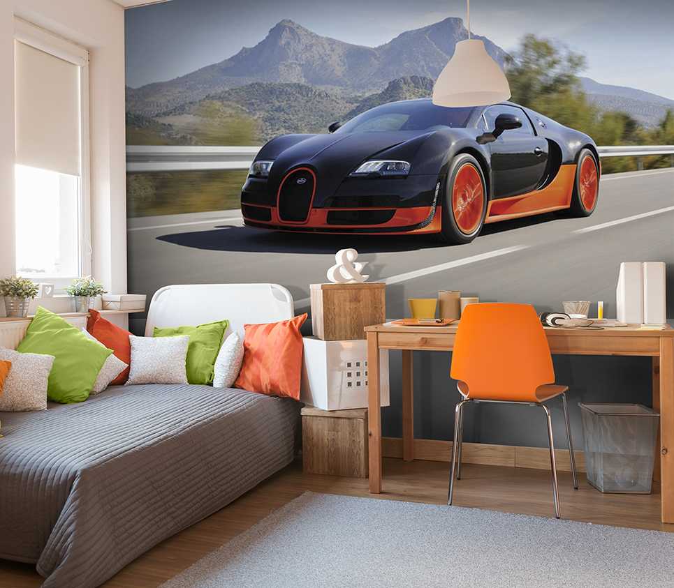 темные фотообои с изображением машины отлично сочетаются с бордовым цветом стены