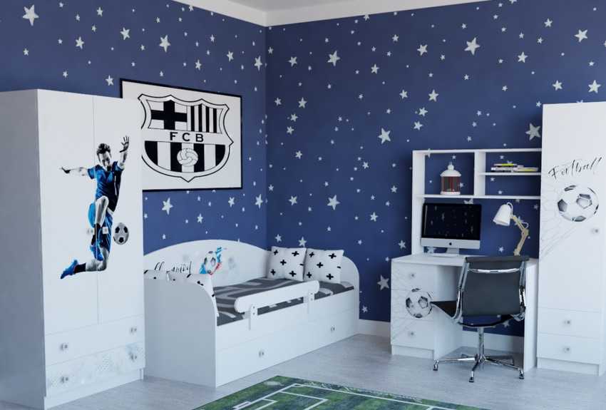 Дополнить интерьер можно с помощью тематического декора, например, подушек, светильников в форме футбольного мяча, ковра и текстиля.