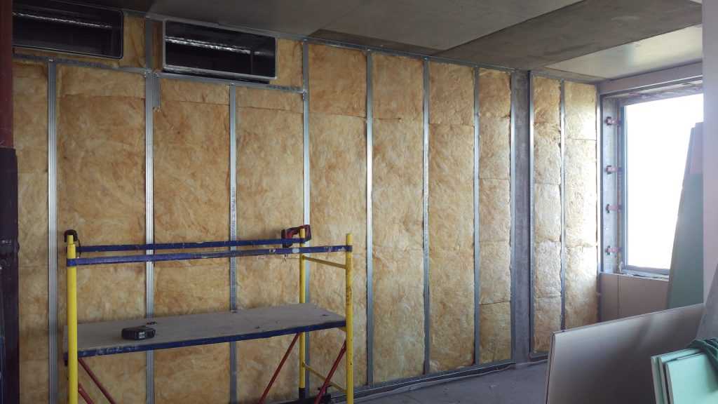 После окончания работ по монтажу лаг укладывалась минеральная вата, для обеспечения звукоизоляции, и удержания тепла. Производителя утеплителя можно выбирать на ваше усмотрение.