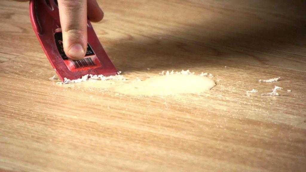 Для удаления потертостей, порезов и царапин применяют шпаклевку. При невозможности приобрести готовую смесь, то ее можно изготовить самому. Она готовится из канифоли, скипидара и сухого пигмента. Для начала нужно смешать 4 части скипидара и одну часть канифоли, а затем добавить краситель определенного оттенка. Полученную смесь наносят на место дефекта на покрытии. После застывания массы, ее зачищают от излишков. Для полировки и шлифовки пола после ремонта применяют мастику.