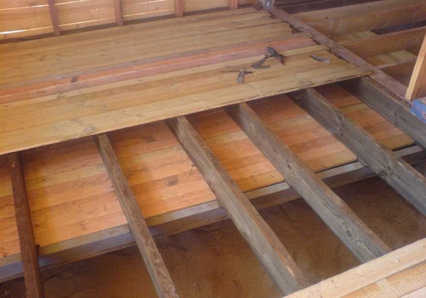 - Доски укладываются на лаги, уложенные на брусья или на сами опорные балки (если балки заделаны в стены, то укладывание лагов на них является обязательным требованием).