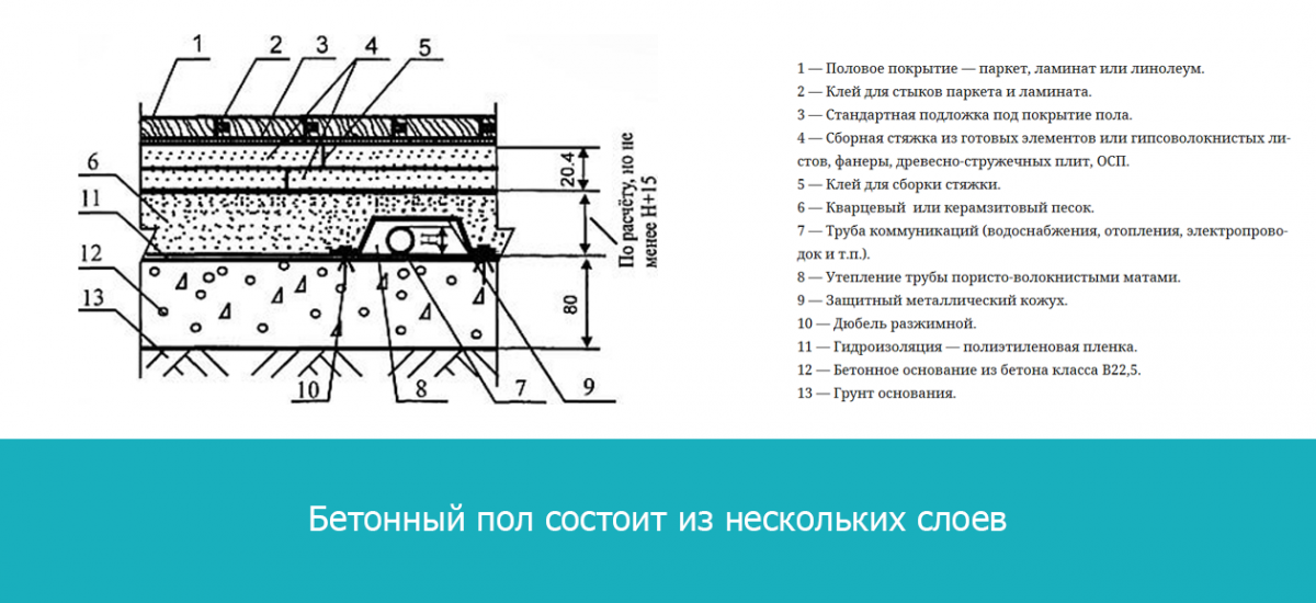 Бетонный пол состоит из нескольких слоев, от нижнего к самому верхнему: