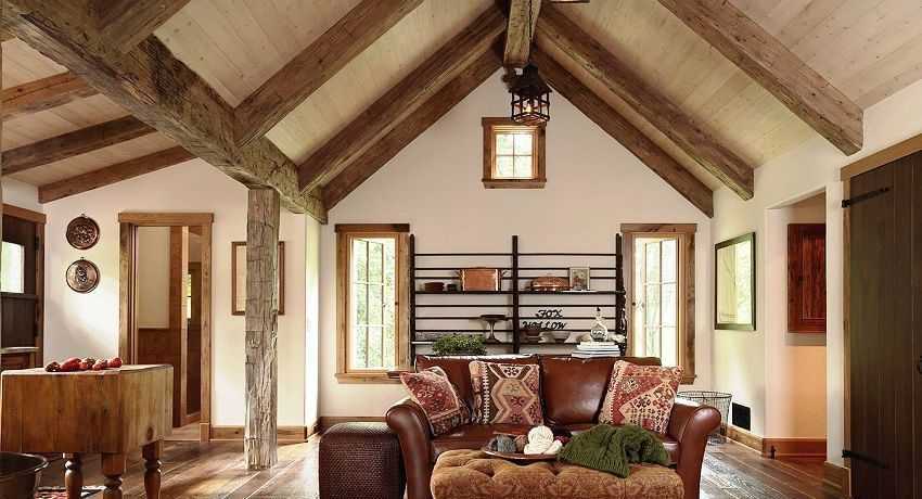 Потолкам в этом случае нужно уделить особое внимание. Их можно обшить деревянными панелями или доской, окрашенной в темный цвет