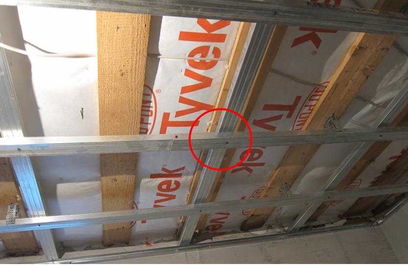 На следующем фото видим, что профили в углу установлены со смещением. Это либо недоделанная конструкция, либо ошибка. При таком монтажа, гипсокартон будет провисать на углу, что недопустимо.