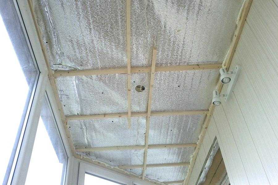 Металлизированное покрытие должно быть направлено в сторону финишной отделки. Если было произведено утепление потолка на балконе или лоджии другим материалом, то пенофол настилается вместо пароизоляции. Герметичность обеспечивается проклеиванием стыков специальным алюминиевым скотчем. При этом исключается образование нахлест.