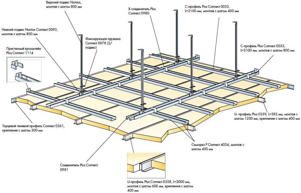 Шаг 1. Нанесение разметки. Для того чтобы выполнить эту задачу правильно, нужно понимать, какова схема каркаса. Она состоит из продольных и поперечных стоек, соединенных между собой крабами и закрепленных на потолке с помощью подвесов.
