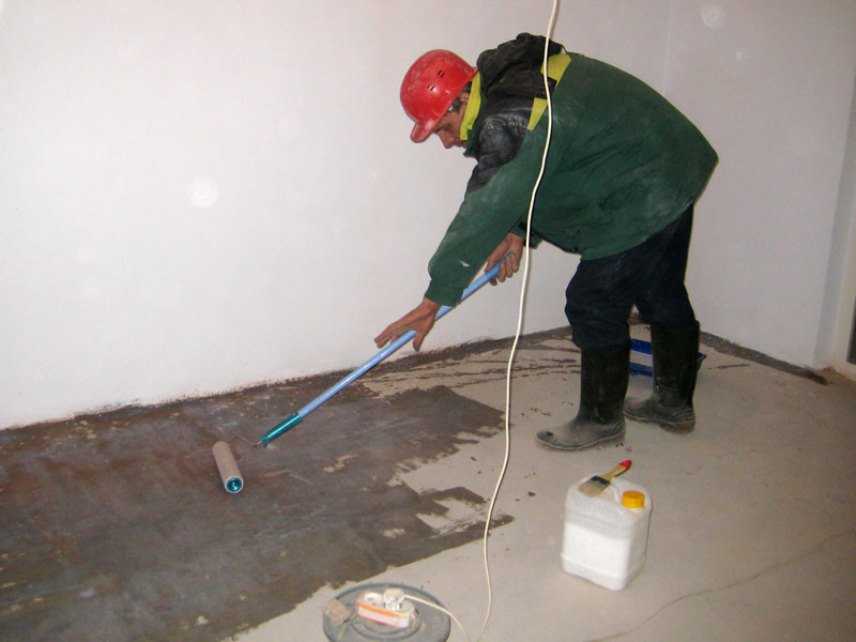 - Состав наносится сначала по периметру. Углы тщательно промазываются. Затем валиком обрабатывается вся поверхность.