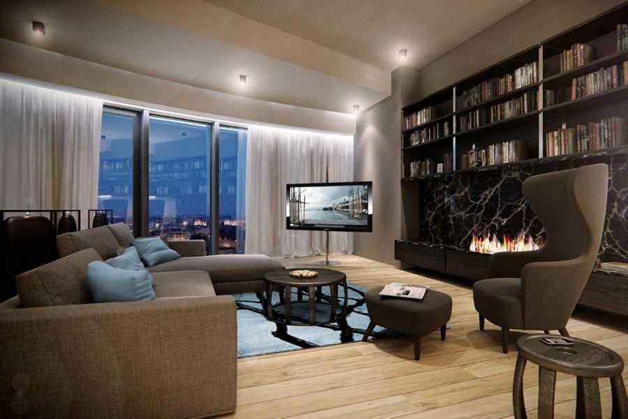 Примеры расстановки акцентов и деталей в коричневой гостиной: