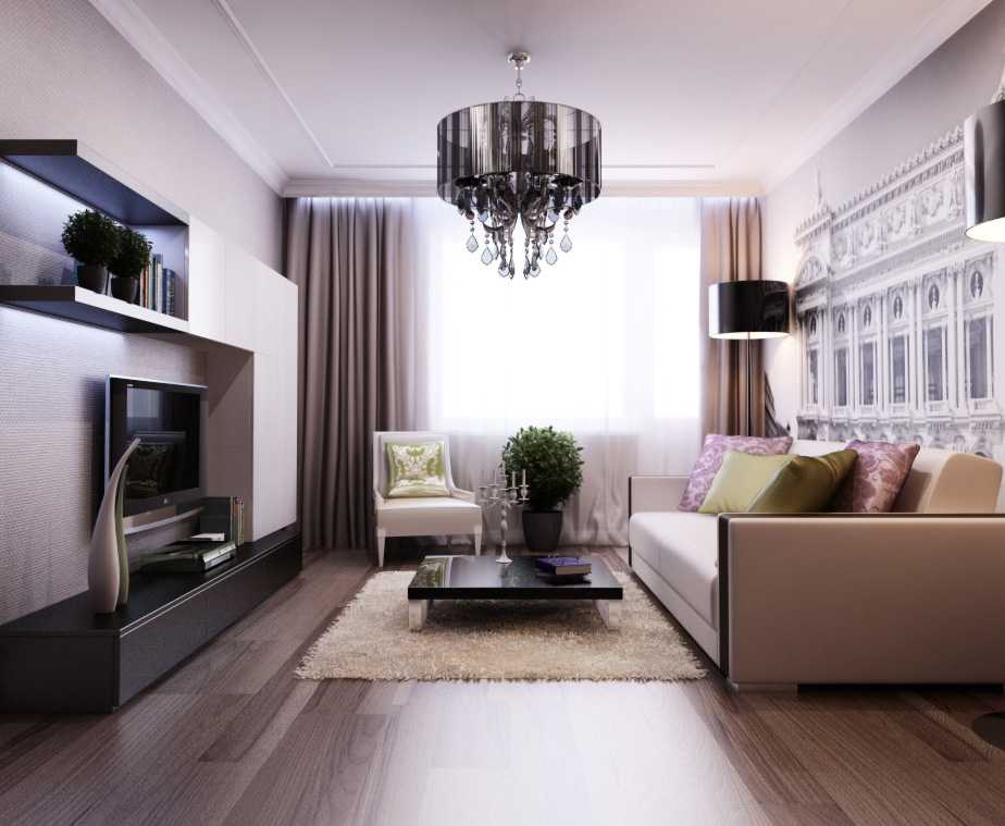 Миниатюрной гостиной необходимы светлые стены. Зрительно увеличить пространство помогают изображения с перспективой, например, дорога, уходящая вдаль. Можно подобрать обои с особой текстурой. Слишком яркая раскраска, объёмный рельеф, крупный принт не подходят для маленькой квадратуры.