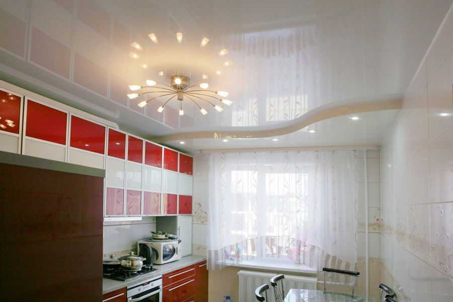Люстрами. Украсить кухню с натяжным покрытием, обладающим светоотражающей способностью, можно красивой люстрой оригинальной формы.