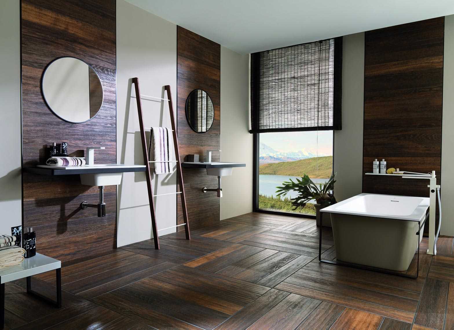Ванная комната с имитацией дерева смотрится по-настоящему шикарно. В арсенале известных фирм присутствует плитка не только с рисунком, но и со структурой древесины. Такие варианты гармонируют с теплыми полами.