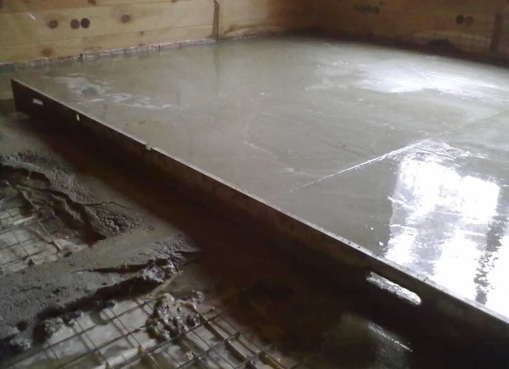 - Когда бетон достигнет уровня маяков, раствор следует разравнять правилом, начиная от дальней стены к выходу. Инструмент следует вести по рейкам-направляющим, снимая при этом излишки бетона. Выполнить заливку необходимо за один заход.