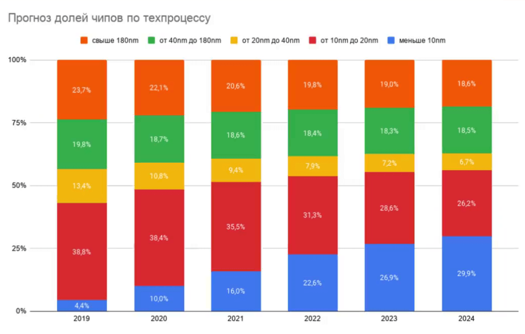 К 2024 году доля чипов с техпроцессом выше 10 нанометров упадёт, потому что будет расти спрос на более передовые разработки.