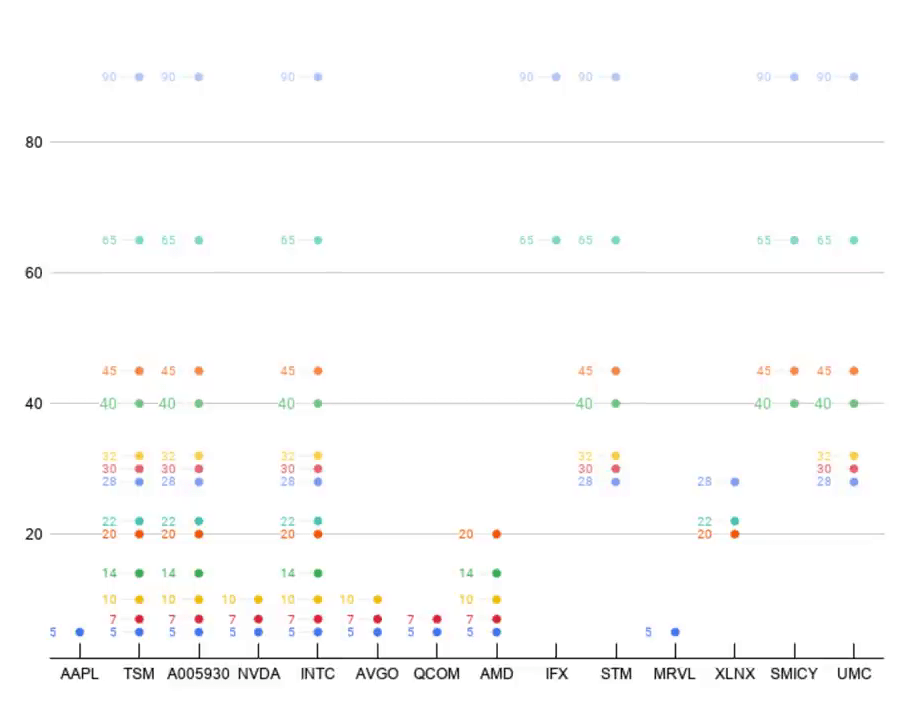 Доля полупроводников на рынке в зависимости от техпроцесса