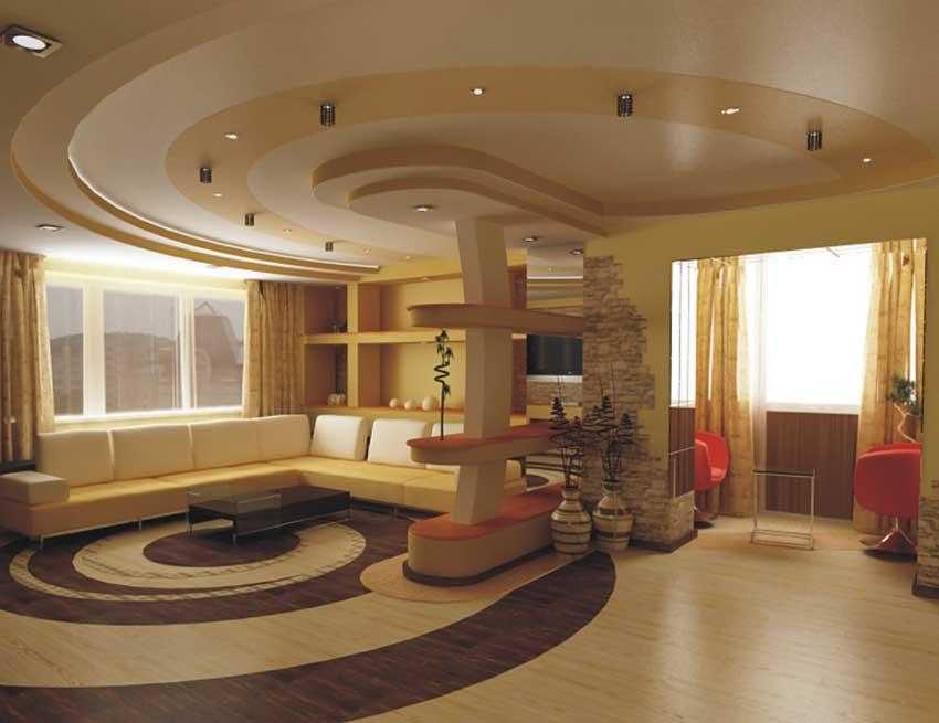 С помощью разных видов осветительных приборов можно разделить комнату на зоны. Для этого на бумаге чертится схема комнаты с зональными акцентами. Затем на бумаге определяется, какой рисунок потолка органично вписывался бы в эту комнату. Вариантов существует множество.