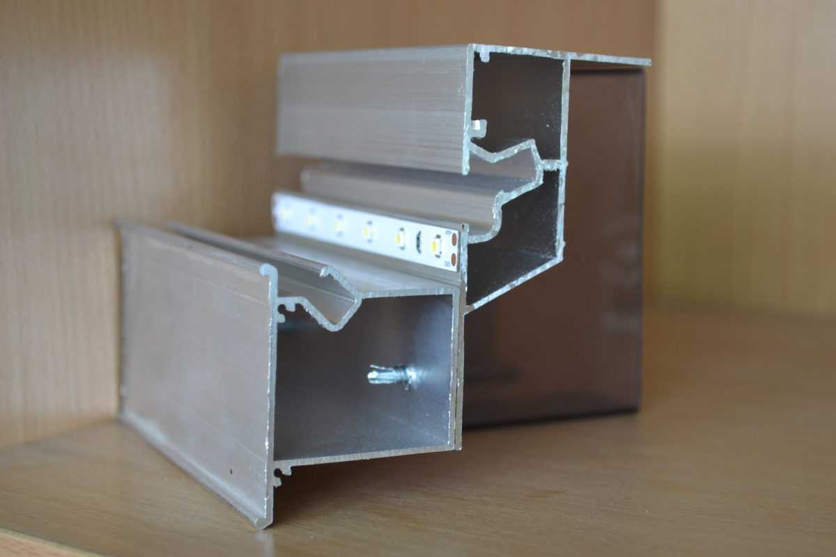 Если планируется укладка диодной ленты, багеты проклеивают алюминиевым скотчем. Тогда лучи не будут просвечивать сквозь щели там, где это не нужно.