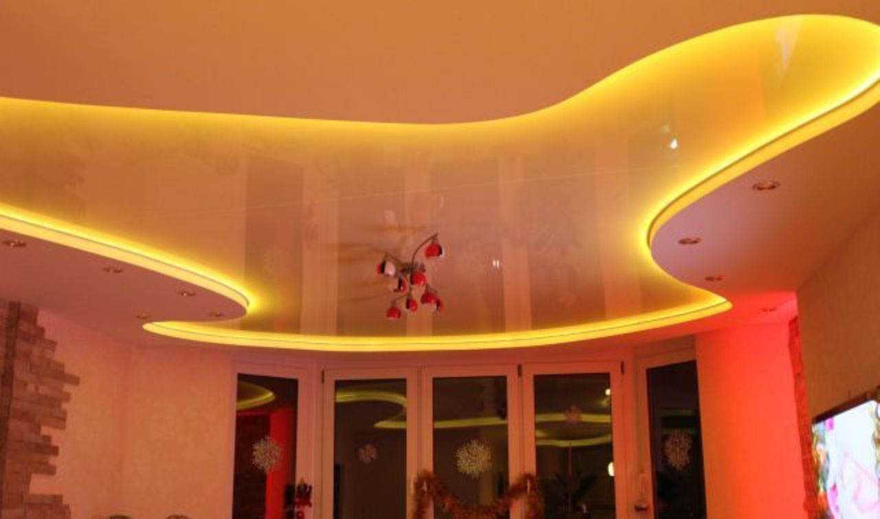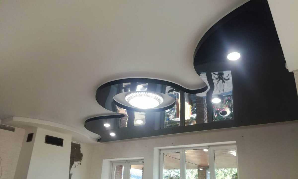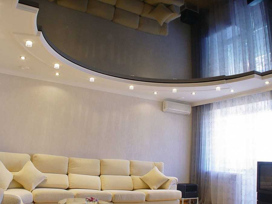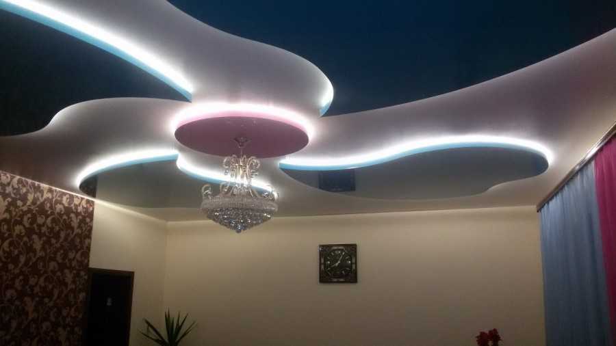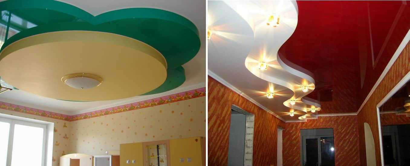 Такие конструкции различаются между собой количеством уровней, дизайном и сложностью технологических работ. Например, можно установить систему из двух ярусов, сделав из натяжного полотна основу потолочной поверхности. Также монтируют трехуровневые потолки, включающие сложные криволинейные элементы, множество оттенков.