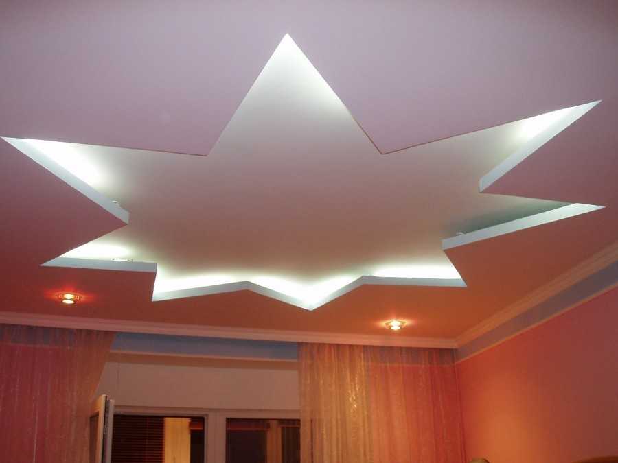 Подиум под люстру. Название говорит само за себя. Если осветительный прибор имеет крупные габариты, можно отделить для него центральную часть на потолке при помощи многоуровневого потолка.
