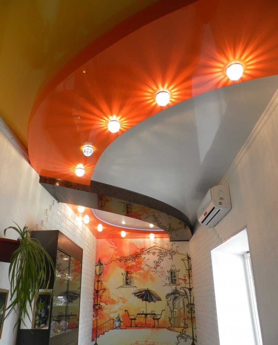 Предлагаем взглянуть на самые интересные способы взаимодействия многоуровневых натяжных конструкций с разными источниками освещения.