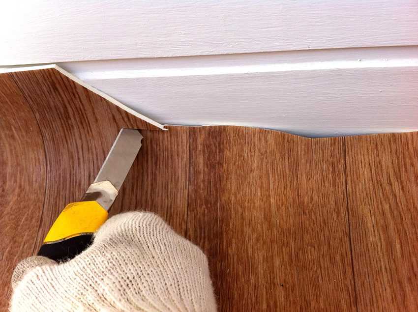 - По всему периметру лист фиксируется плинтусами (детальнее: “Как класть линолеум – правила укладки”).