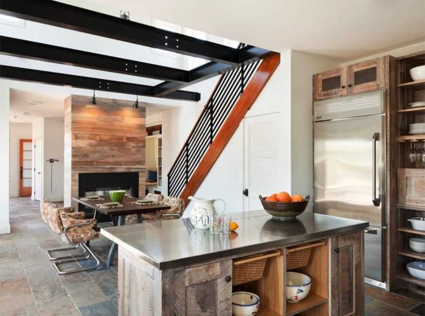 Отделка кухни природным камнем очень разнообразна, но будет лучше его использовать в качестве декора в обеденной зоне. Большой популярностью пользуется натуральный камень в качестве напольного покрытия