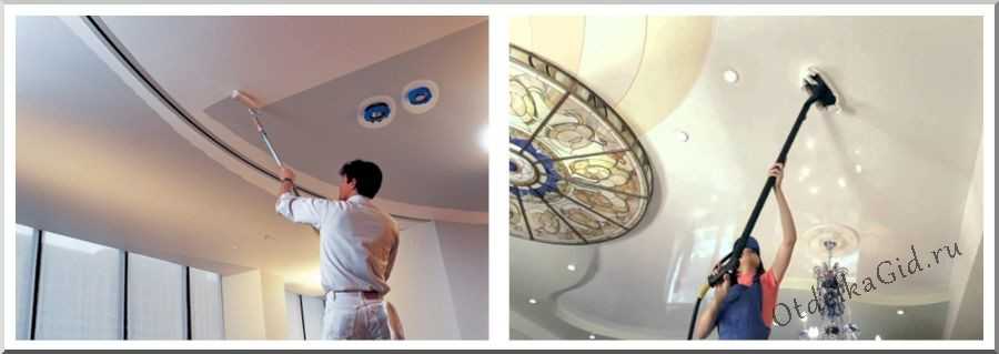 Пленочный потолок элементарно очищается при помощи моющего пылесоса, а загрязнения на гипсокартонном покрытии чаще всего можно только перекрасить