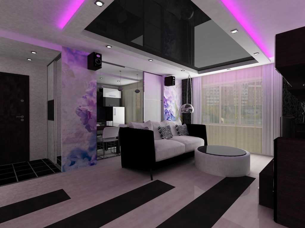 Часто в малогабаритных квартирах кухню совмещают с гостиной – подобный вариант дизайна выглядит современно и оригинально. Чтобы помещение гармонично сочетало в себе место для отдыха и приёма пищи, дизайнеры рекомендуют делить пространство на зоны с помощью двухъярусных натяжных потолков. Для этого в конструкциях нужно применить установку различных геометрических деталей и выполнить разграничение с помощью прямых линий.