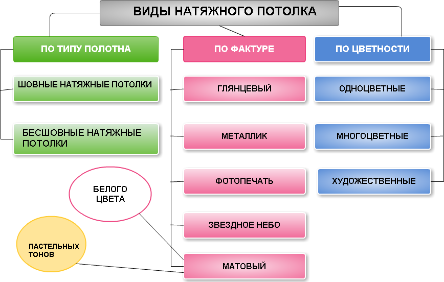 На рынке можно встретить около 250 различных расцветок материалов для натяжных потолков, из которых лишь 20 – 25 оттенков относятся к тканевым материалам. Остальные варианты предлагаются для ПВХ-поверхностей и подразделяются на несколько групп, в зависимости от стиля отделки комнаты: