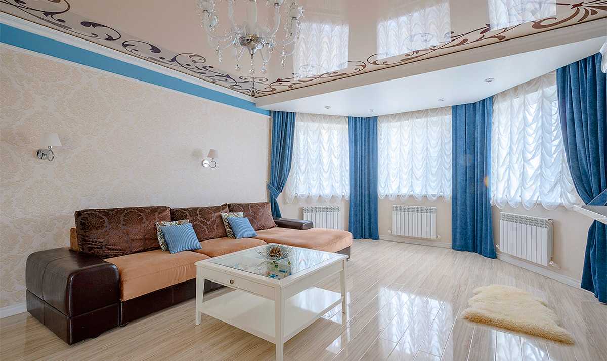 - Широкий выбор цветов и фактур. Потолки могут быть глянцевыми, матовыми и сатиновыми. Цвет может быть любым, причем часто он ярче, чем на ткани.