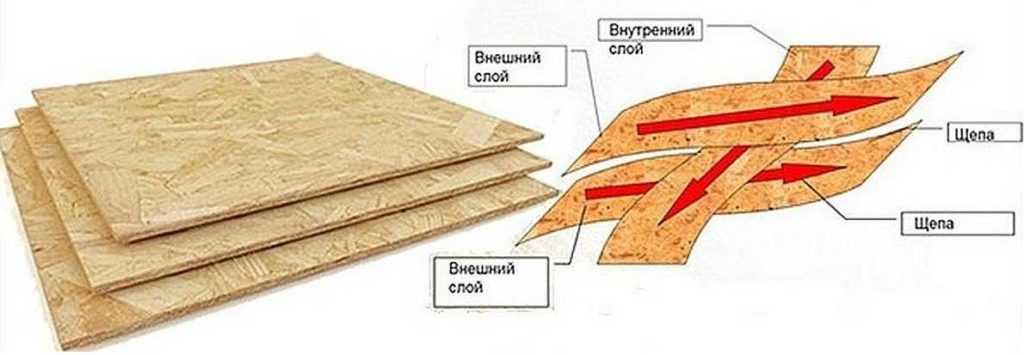 Для повышения прочности и упругости материал делают многослойным. Это видно на срезе и торцах плиты. В наружных слоях щепки располагают вдоль длинной стороны плиты, во внутренних — поперек. Это делает ее намного прочнее. Кроме повышенной прочности и водостойкости, свойства ОСП такие: