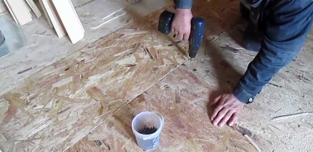 - Фиксируют ОСБ на полу при помощи 40 мм саморезов через каждые 30 см. При этом шляпки саморезов нужно обязательно утопить в толще плиты.