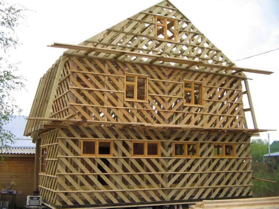 Компромиссным вариантом служит использование косой обрешетки. Она укладывается под углом 45 градусов. Это способствует повышению жесткости по сравнению с прямой обрешеткой. Для увеличения жесткости в качестве такой обрешетки лучше подходят доски толщиной 25 мм. Доска крепится к каждой стойке каркаса двумя гвоздями. В связи с повышенным расходом материалов и сложностью работ такой способ применяется крайне редко, поэтому нет статистической информации об эксплуатационных характеристиках построенных домов.