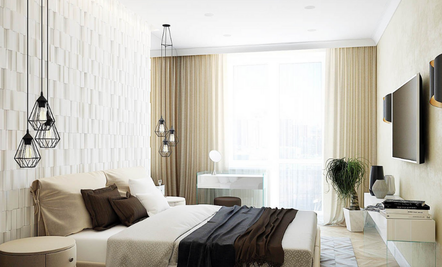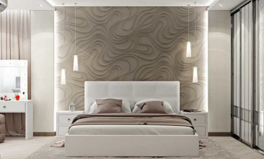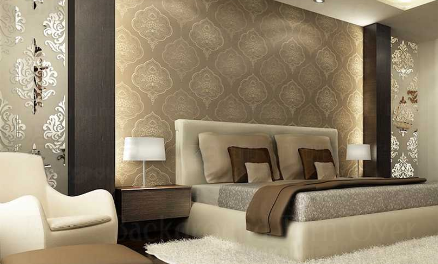 Объемными изображениями и орнаментами можно отделать одну из стен маленькой спальни. Это может быть изголовье кровати, стена за телевизором или произвольно выбранная область. Остальную часть спальни лучше отделать светлыми однотонными или с мелким невзрачным узором обоями.