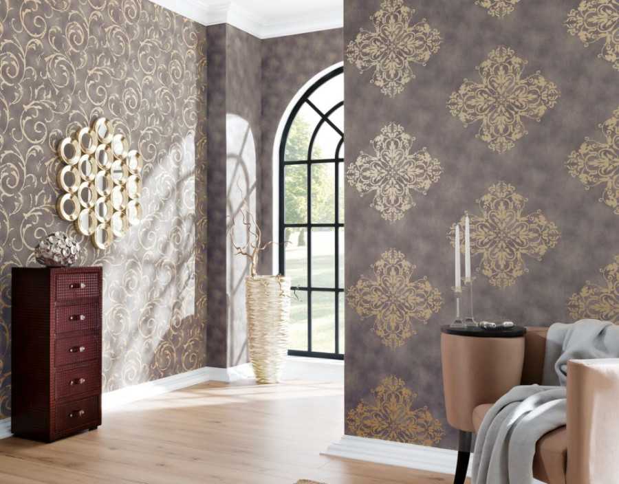 Вычурный, дорогой стиль. Его отличает показная роскошь, богатство. Для гостиных следует подбирать только высококачественные, брендовые обои. Например, подойдут шикарные итальянские полотна безупречного качества, на которых изображены вензеля, выделяющиеся на однотонном фоне. Такие обои будут замечательно смотреться в ансамбле с дорогой мебелью, золотистым декором, бронзой и серебрением в интерьере.