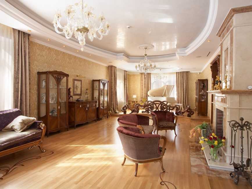 Потолок гостиной может быть многоуровневым. Массивная люстра или элементы витражного стекла подчеркнут характер стиля. Для отделки стен рекомендуется использовать монотонное покрытие: тканевые обои, штукатурку или краску. Допускается легкий орнамент, не перегружающий композицию.