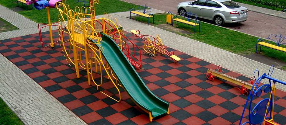 Резиновое покрытие для детских площадок: укладка плитки из резиновой крошки на песчаное основание похожа на укладку тротуарной плитки