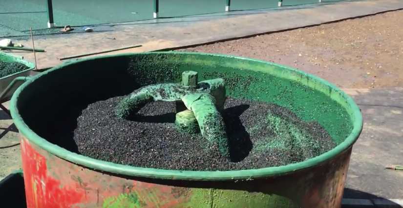 Для приготовления рабочего состава применяется шнековый и роторный миксер для резиновой крошки, который похож на бетономешалку с вертикальной загрузкой, но имеет более широкие лопасти для тщательного перемешивания компонентов.