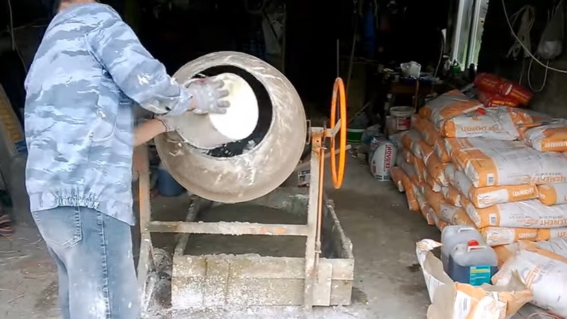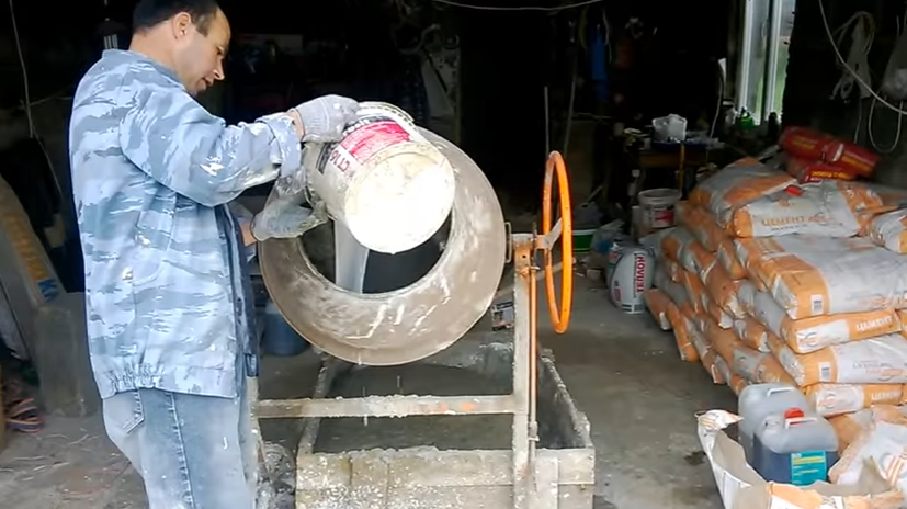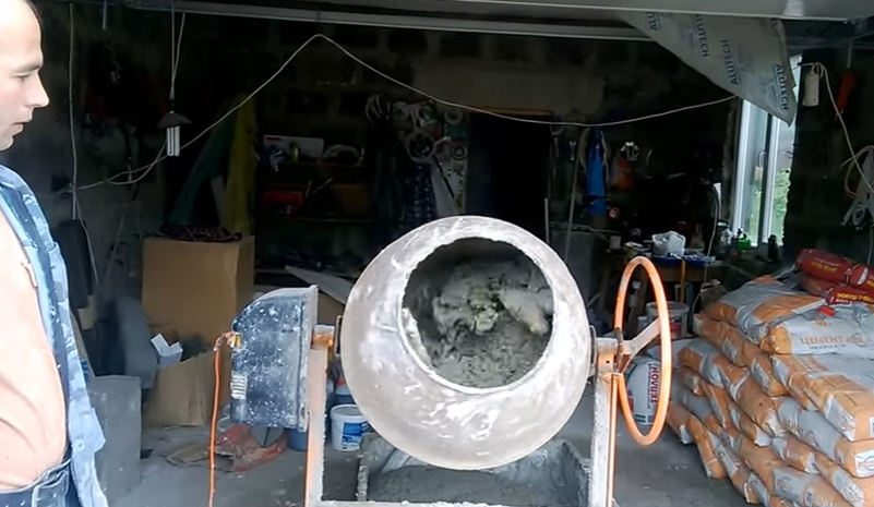 Если на стенках опять налипает смесь, то нужно периодически останавливать мешалку и очищать ее стенки. Бывают ситуации, когда масса посредине объема мешалки нормальная, а по бокам жидкая. Остановите механизм, выберите из средины два-три ведра массы, наклоните мешалку и опять включите ее. В таком положении масса лучше перемешивается. Все нормально – опять добавьте вынутую массу, наклоните мешалку и включите двигатель.