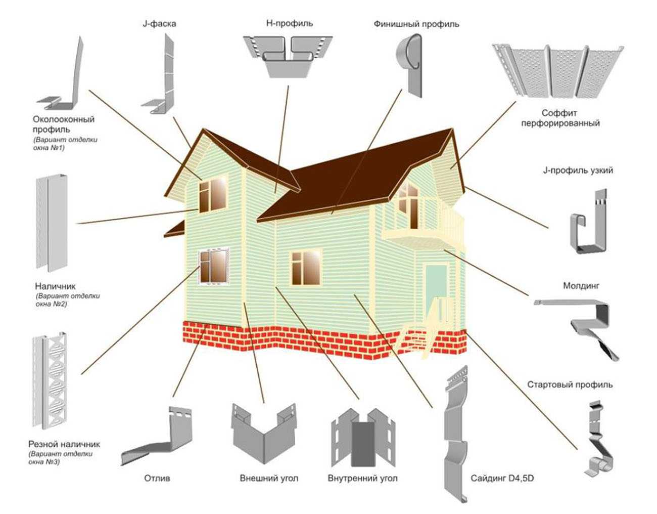 Помимо рядовых панелей, для установки обшивки требуются дополнительные элементы. Комплектующие, или, как их еще называют, доборные элементы, без которых обшить дом будет затруднительно (фото ниже):